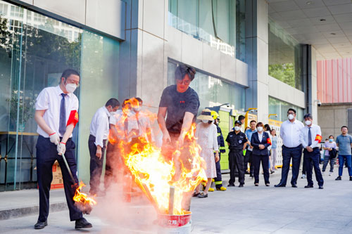 隨后,全體參加演練的人員在東側(cè)廣場集合,由物業(yè)安保部向大家進(jìn)行滅火器材使用講解,演示如何使用自救呼吸器,并組織演練人員現(xiàn)場實(shí)操。演練和演示活動(dòng)結(jié)束后,組織方相關(guān)人員進(jìn)行了總結(jié)點(diǎn)評,為進(jìn)一步提升應(yīng)急處置能力提出了改進(jìn)建議和措施。